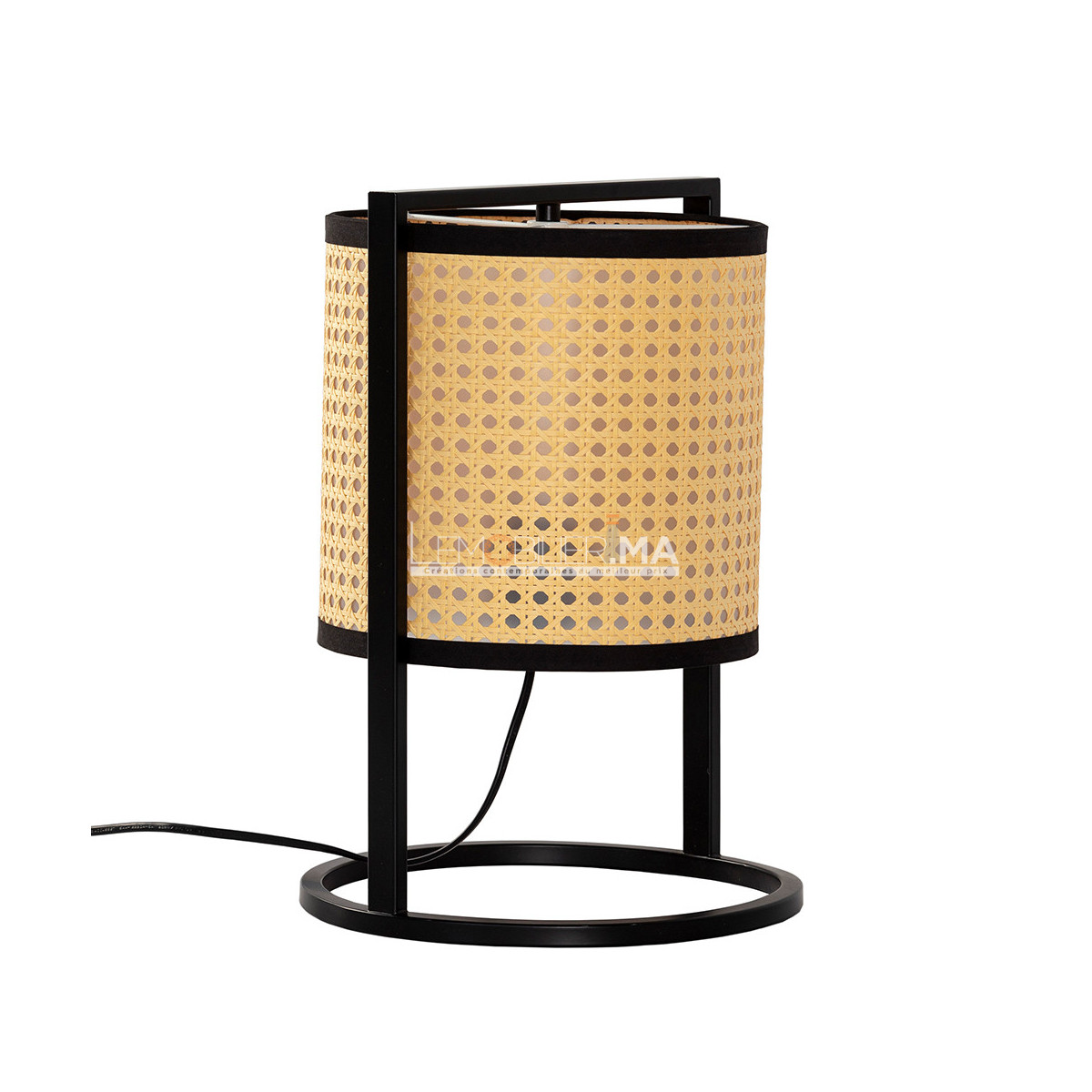 La lampe à poser RAKU revisite l’esprit du cannage avec une structure graphique et contemporaine. Son abat-jour cylindrique en rotin tressé laisse filtrer une lumière tamisée, tout en projetant un motif subtil au mur. L’ensemble est soutenu par une base circulaire en acier noir époxy qui confère à cette lampe une grande stabilité et une allure sculpturale.