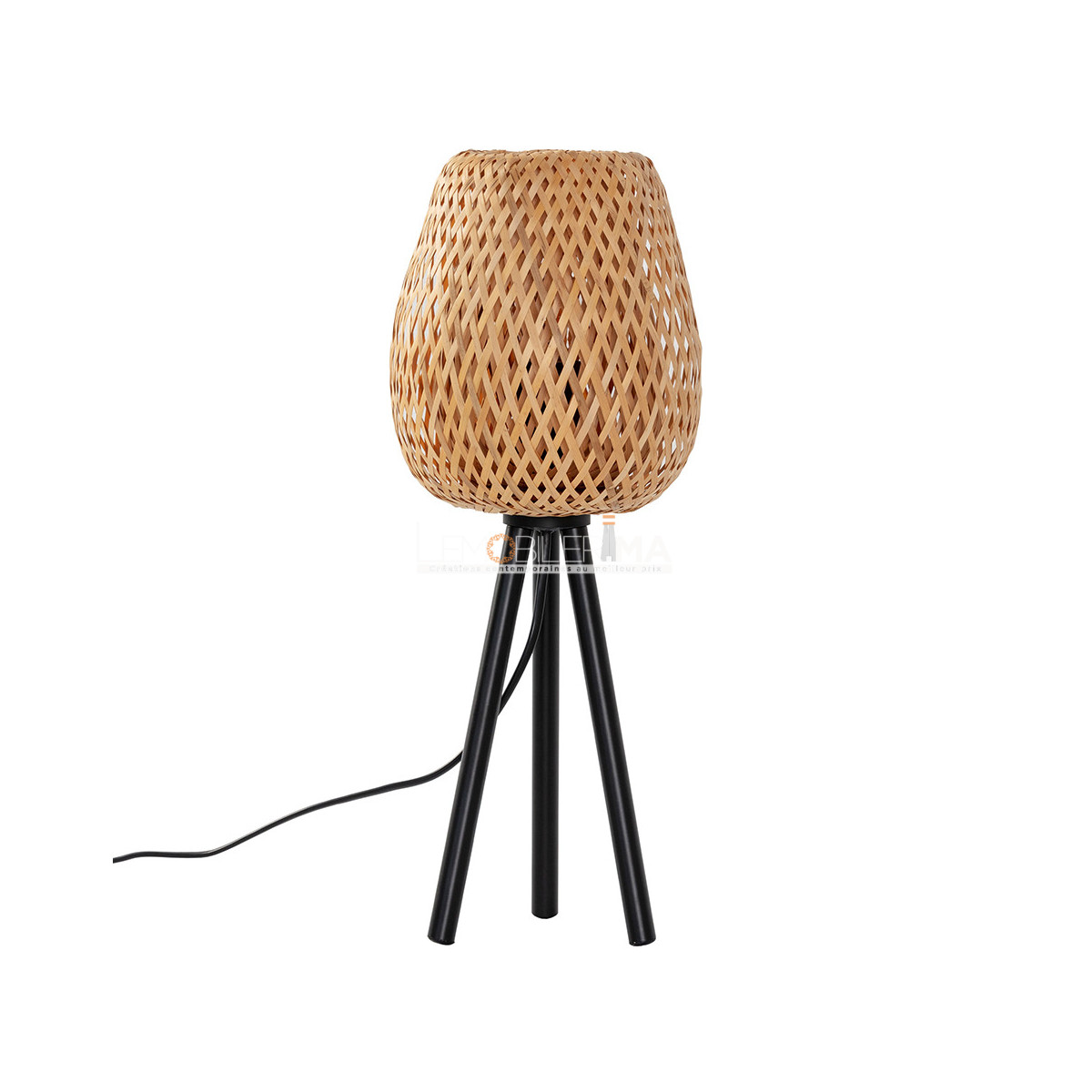 Son abat-jour en bambou naturel tressé à la main crée un subtil jeu d’ombres au mur une fois allumée, évoquant les paysages solaires du sud. Son piétement tripode en acier laqué époxy noir assure une grande stabilité tout en contrastant élégamment avec la chaleur du tressage.