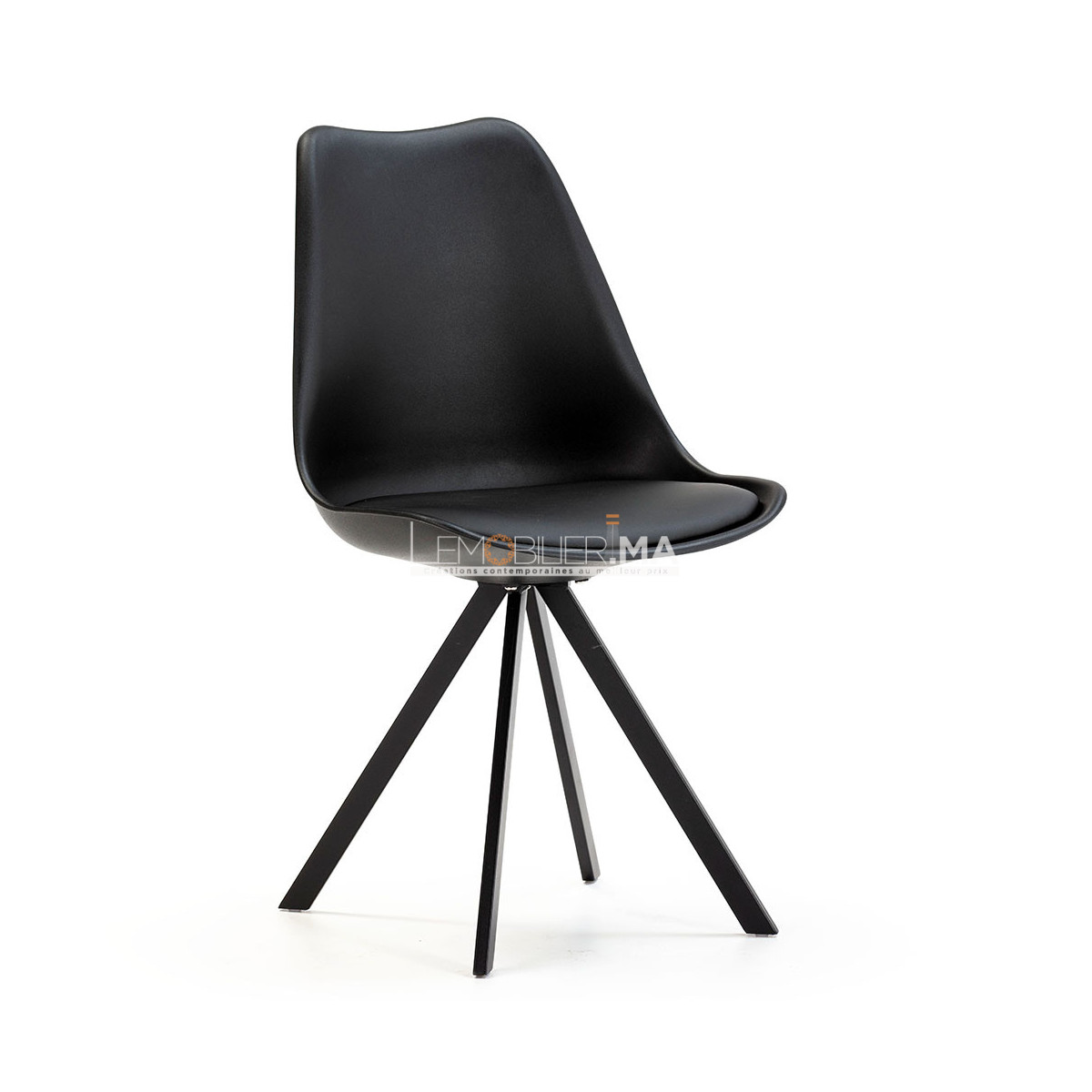 La structure est entièrement ton sur ton : piétement en acier laqué mat finition époxy, assorti à la coque, avec une teinte noir profond subtilement mate. Ce coloris apporte une allure plus graphique et intemporelle à une table de salle à manger ou un espace de travail. Les pieds inclinés en pyramide inversée assurent stabilité et élégance, renforcés par des ancrages solides sous la base pour un usage intensif.