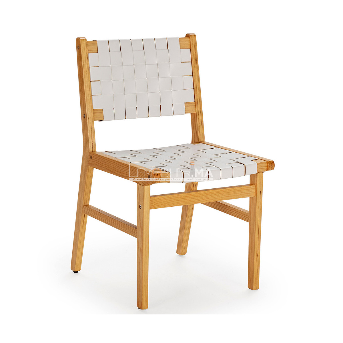 Sa structure en chêne massif, légèrement teintée miel, offre stabilité et chaleur. Le contraste avec le cuir tressé blanc (ou brun cognac, selon la version) renforce son caractère tout en apportant une vraie modernité. Grâce à son format compact et à ses lignes nettes, la chaise RUKT se glisse aussi bien autour d'une table de salle à manger que dans une entrée, une chambre ou un espace de travail. Une pièce hybride, pensée pour durer et évoluer avec vos envies.