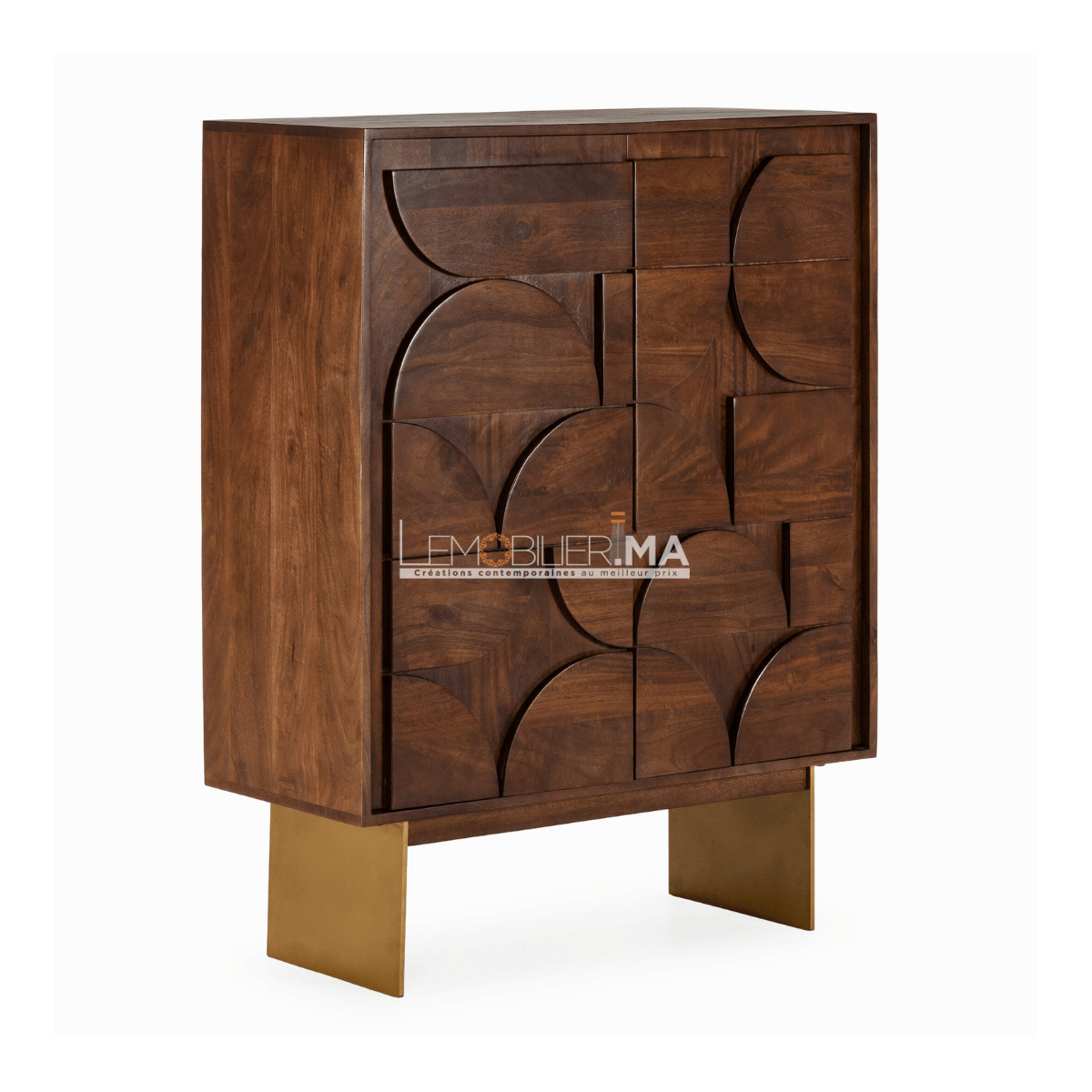 Le buffet haut MONROVIA prolonge avec force et élégance l’identité de la collection du même nom, en affirmant un caractère sculptural et résolument haut de gamme. Réalisé en bois de noyer massif, il se distingue par son travail de façade en relief, composé d’arcs et de demi-cercles finement sculptés qui forment un motif graphique puissant. Chaque panneau capte la lumière différemment, révélant la profondeur du veinage et donnant au meuble une présence presque architecturale, à la frontière entre mobilier et pièce décorative.