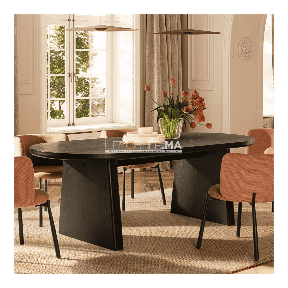 La table VADUZ, dans sa déclinaison en chêne massif cérusé noir, affirme un caractère plus audacieux et résolument contemporain, tout en conservant l’élégance sculpturale qui fait l’ADN du modèle. Sa silhouette aux lignes organiques reste douce et fluide, mais le cérusage noir vient souligner avec force le veinage naturel du chêne, créant un jeu de textures subtil et profond. Le plateau, réalisé en chêne cérusé déployé, capte la lumière différemment selon l’angle, offrant une lecture raffinée et vivante du bois. Cette version impose une présence chic et architecturale, idéale aussi bien en table à manger, bureau de direction ou table de réunion.