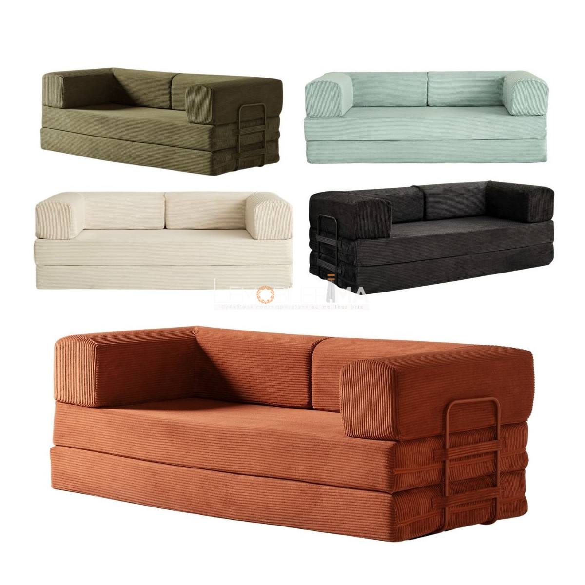 Pensé comme une pièce centrale du salon, le canapé convertible MIMBO conjugue design iconique, modularité avancée et confort durable. Son esthétique généreuse, soulignée par un gros velours côtelé à la texture profonde, lui confère une présence chaleureuse et contemporaine, capable de s’intégrer aussi bien dans un intérieur minimaliste que dans une ambiance plus expressive. Il se distingue par une conception intelligente permettant 4 positions d’usage distinctes :