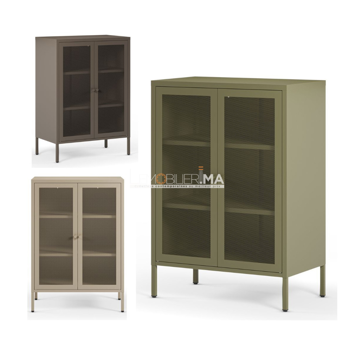 Entièrement réalisé en acier laqué époxy mat, il reprend les codes esthétiques emblématiques de la collection MANO : une structure fine, des lignes nettes et des portes habillées de résille métallique déployée ton sur ton. Cette texture délicate joue avec la lumière et laisse subtilement deviner les objets rangés à l’intérieur, créant un équilibre harmonieux entre discrétion et mise en valeur.